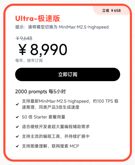 MiniMax 2.5 的 Ultra 极速版本,价格快赶上 Claude Max 套餐了(当然还比不上 Claude 的 5x 模式)。